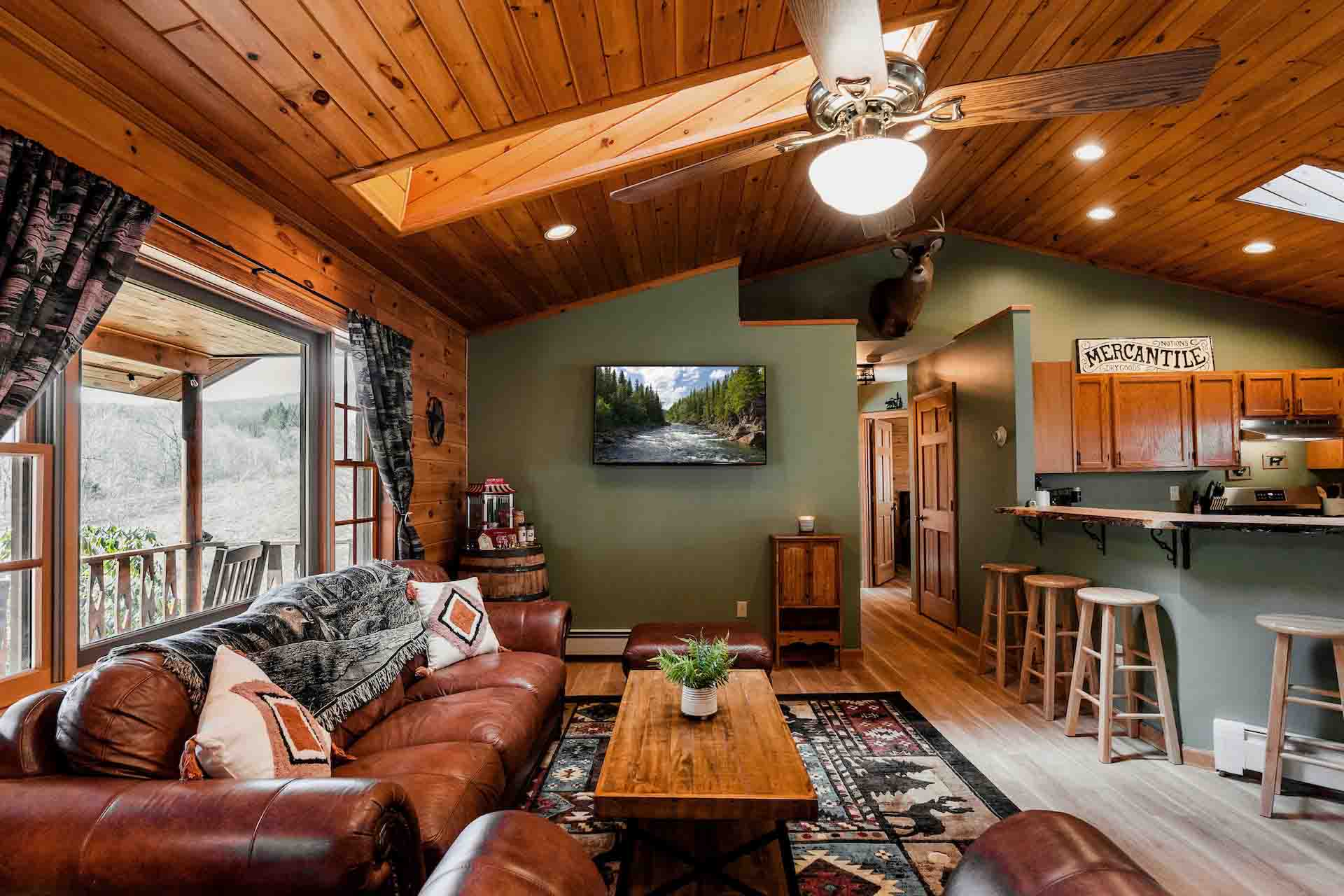 The dark wood panelling and furnishings, red-draped fourposter bed, and black stone bathroom evoke the charm of a secluded Sierra Nevada.